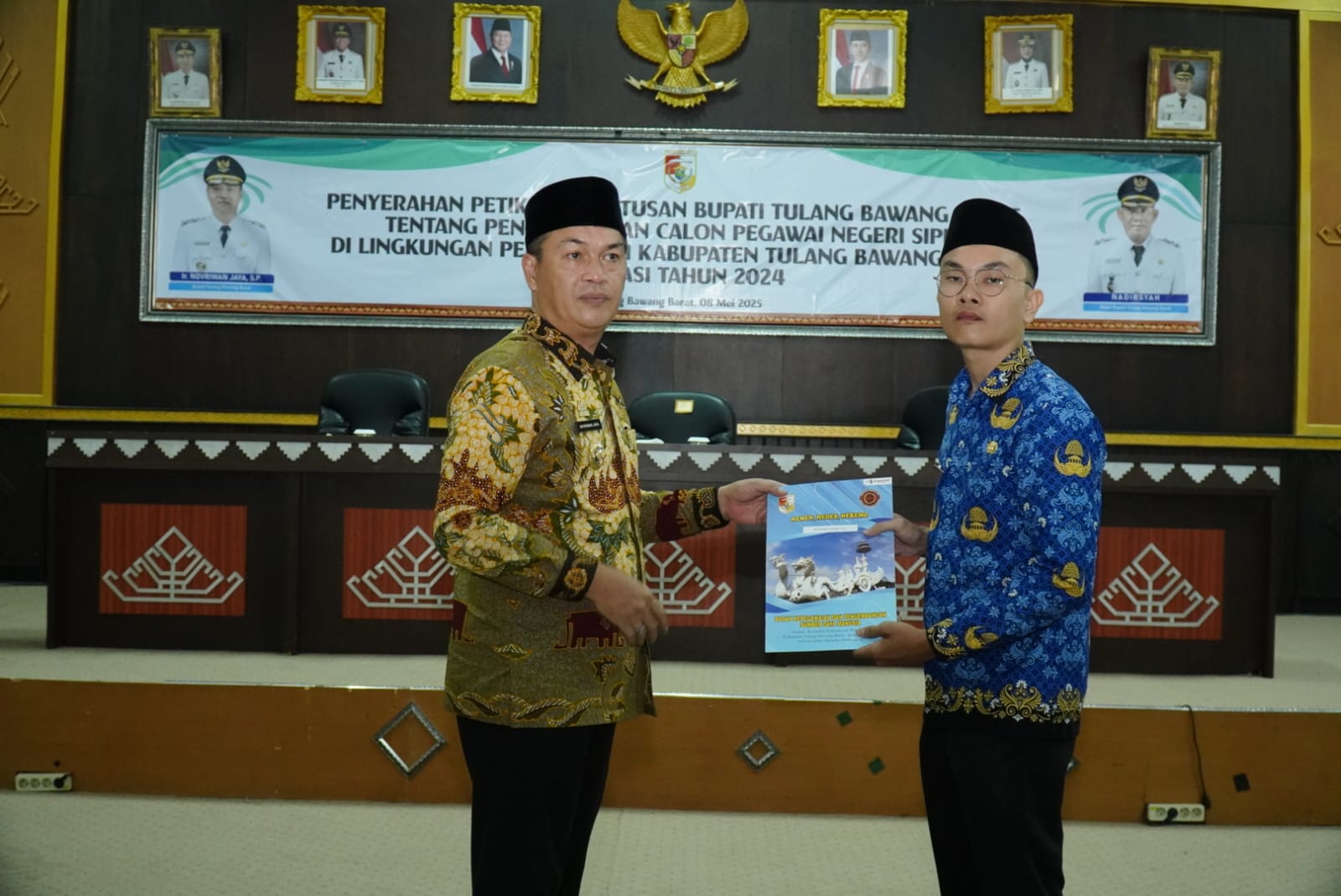 TUBABA,NB – Bupati Tulangbawang Barat (Tubaba) Ir. Novriwan Jaya, S.P. menyerahkan Surat keputusan pengangkatan Pegawai Negeri Sipil (PNS) formasi tahun 2024 dan surat pengangkatan CPNS tahun 2025 Formasi Lulusan STTD di Lingkup Pemkab Tubaba.