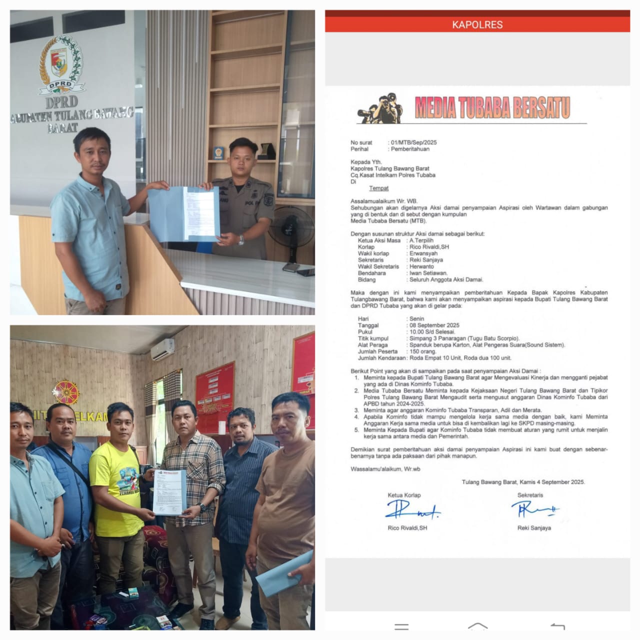 TUBABA,NB- Ratusan wartawan yang tergabung di Media Tubaba Bersatu (MTB) kabupaten Tulang Bawang Barat (Tubaba) Lampung. akan gelar aksi damai di depan kantor Dinas kominfo dan di depan Gedung Dewan perwakilan Rakyat Daerah (DPRD) kabupaten setempat pada senin 9 september 2025 mendatang.